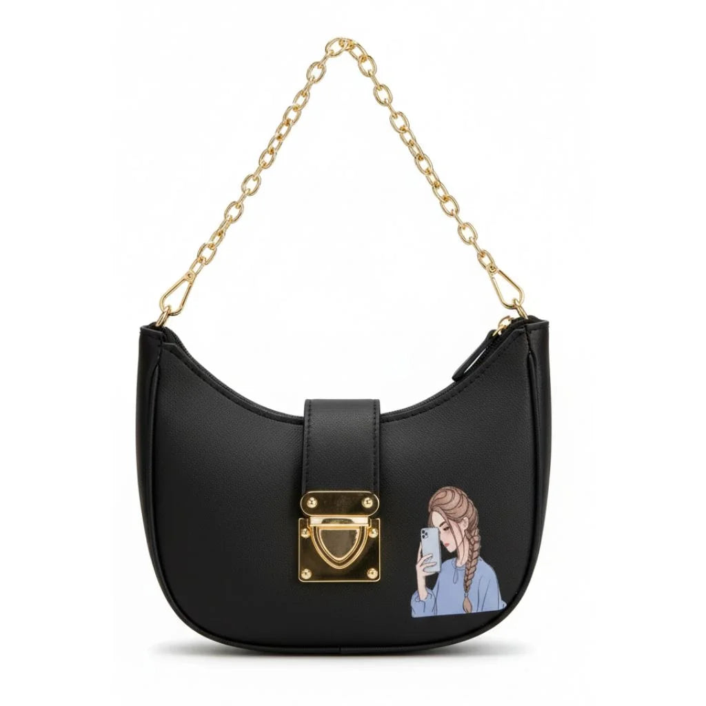 Unleash your bold side with the ChicAura Chain Baguette – a fashion-forward statement piece featuring modern flair and unique graphic detail. This local gem is designed for style-savvy women who love to elevate everyday looks with confidence and class. The sleek black silhouette, luxe gold chain strap, and graphic artwork make this the perfect handbag to take from day to night effortlessly.