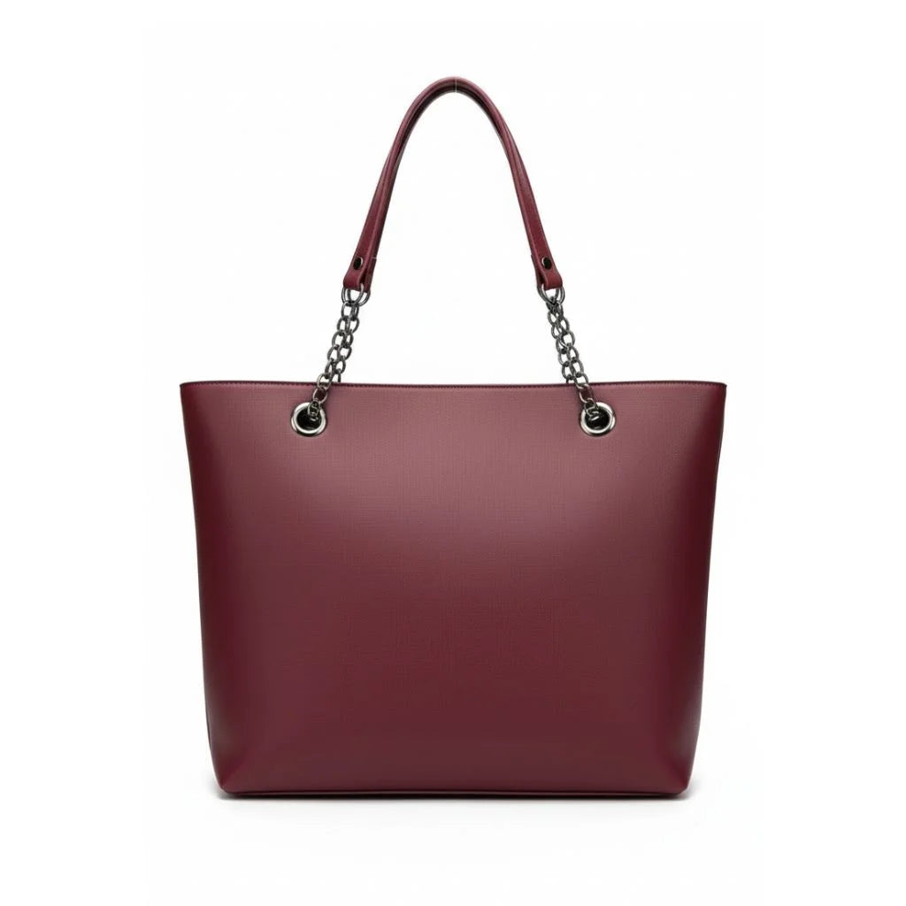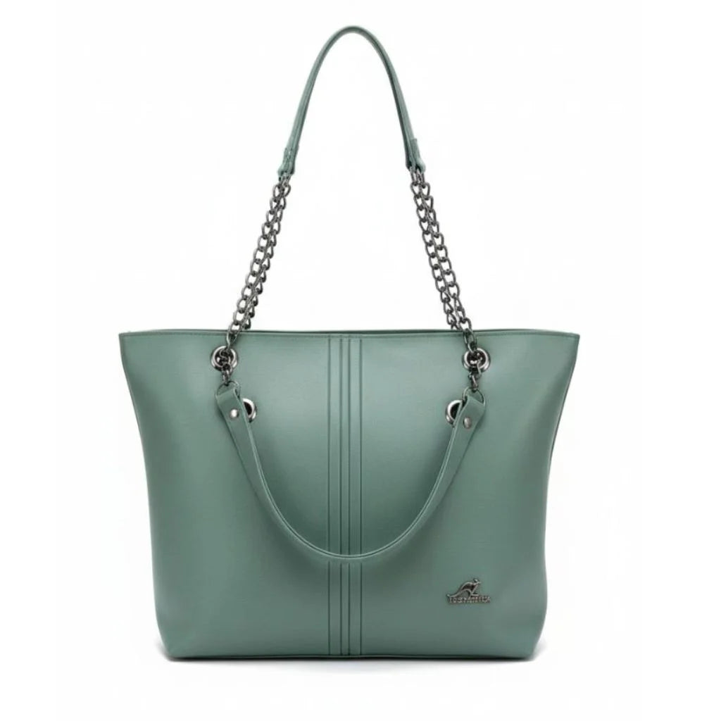 The Sage Chain Elegance Tote blends modern minimalism with everyday practicality. Designed in a soft-structured silhouette, it features sleek vertical stitch detailing and stylish metal chain-accent shoulder straps for a refined, premium look. Spacious and lightweight, this tote is perfect for work, shopping, and daily carry.